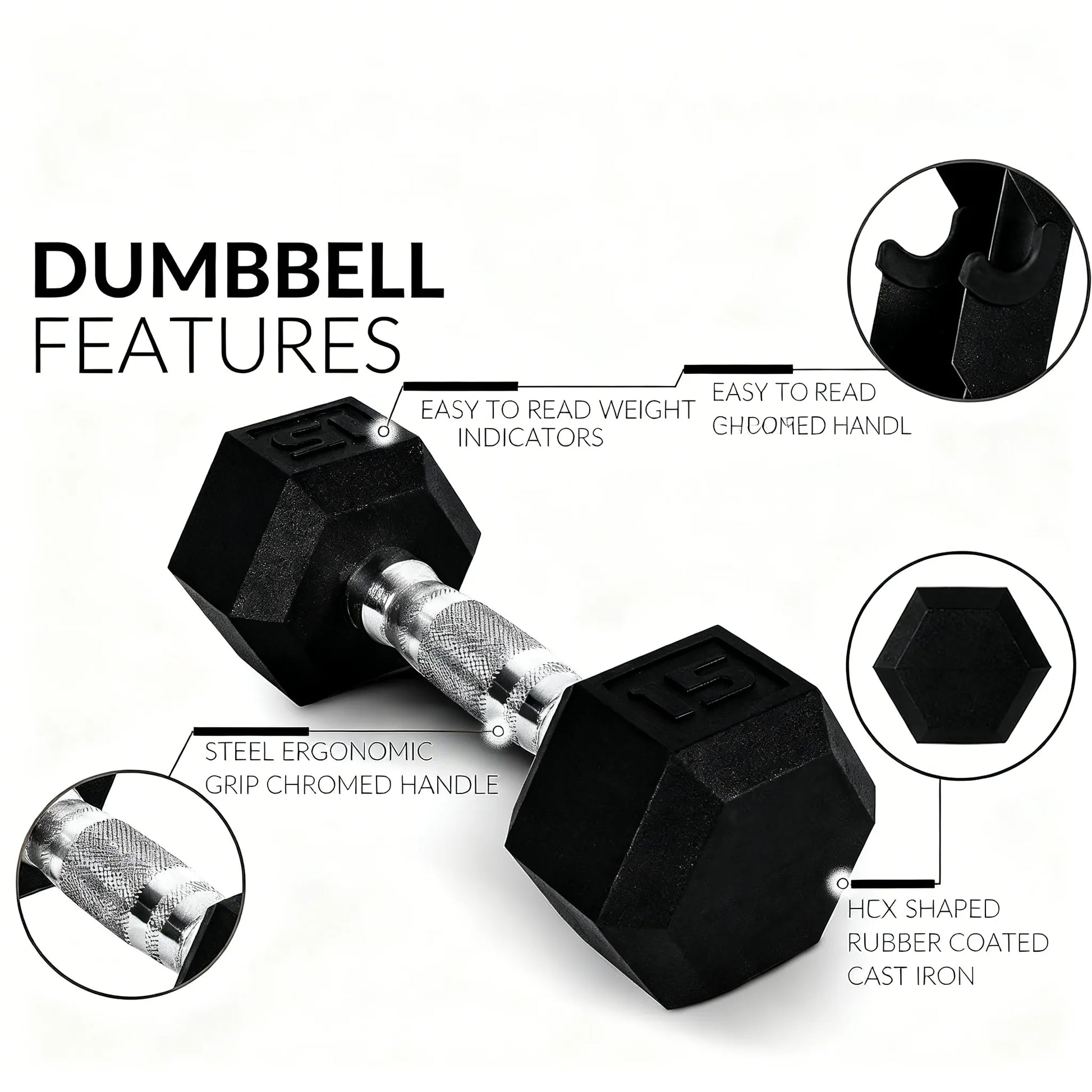 - Ergonomic Dumbbell Design: Hex-shaped cast iron (rubber-coated) prevents rolling; textured chrome handle for a secure grip.
