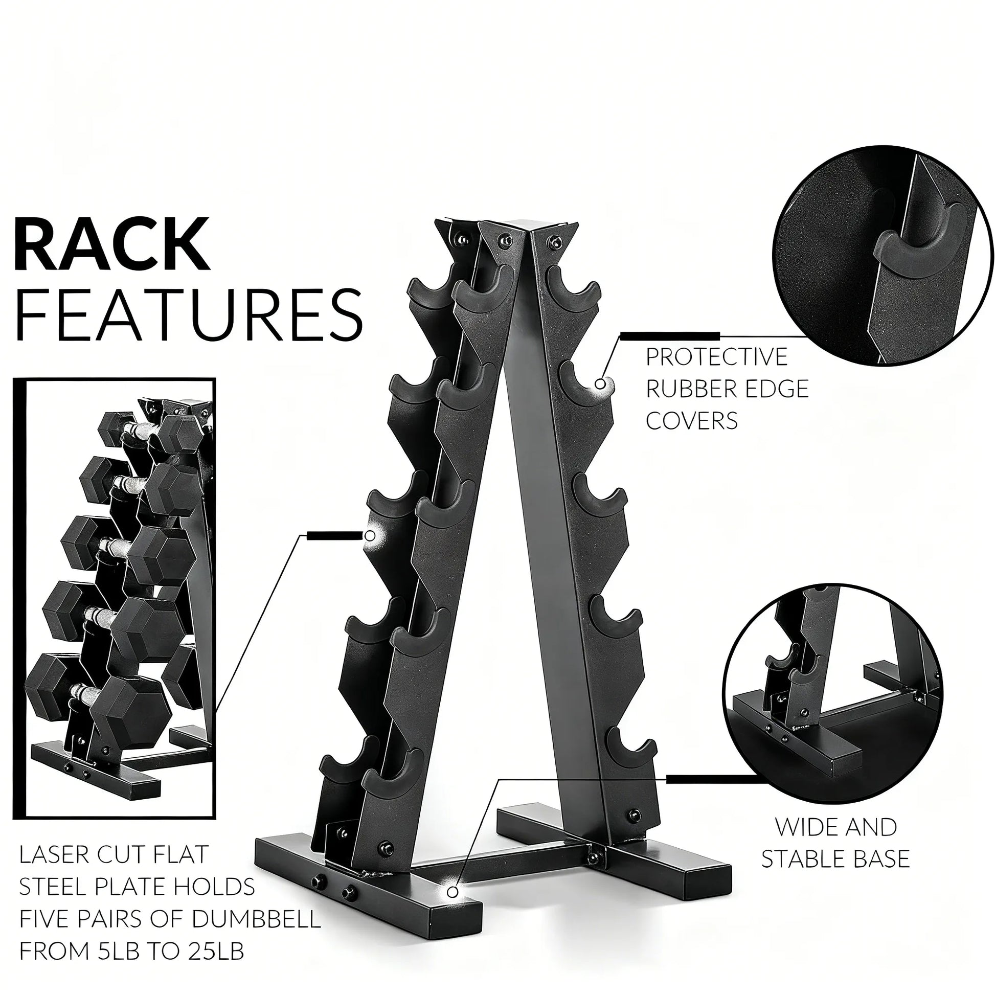 - Vertical Storage Rack: Holds 5 dumbbell pairs; features protective rubber edges and a wide, stable base for safe organization.