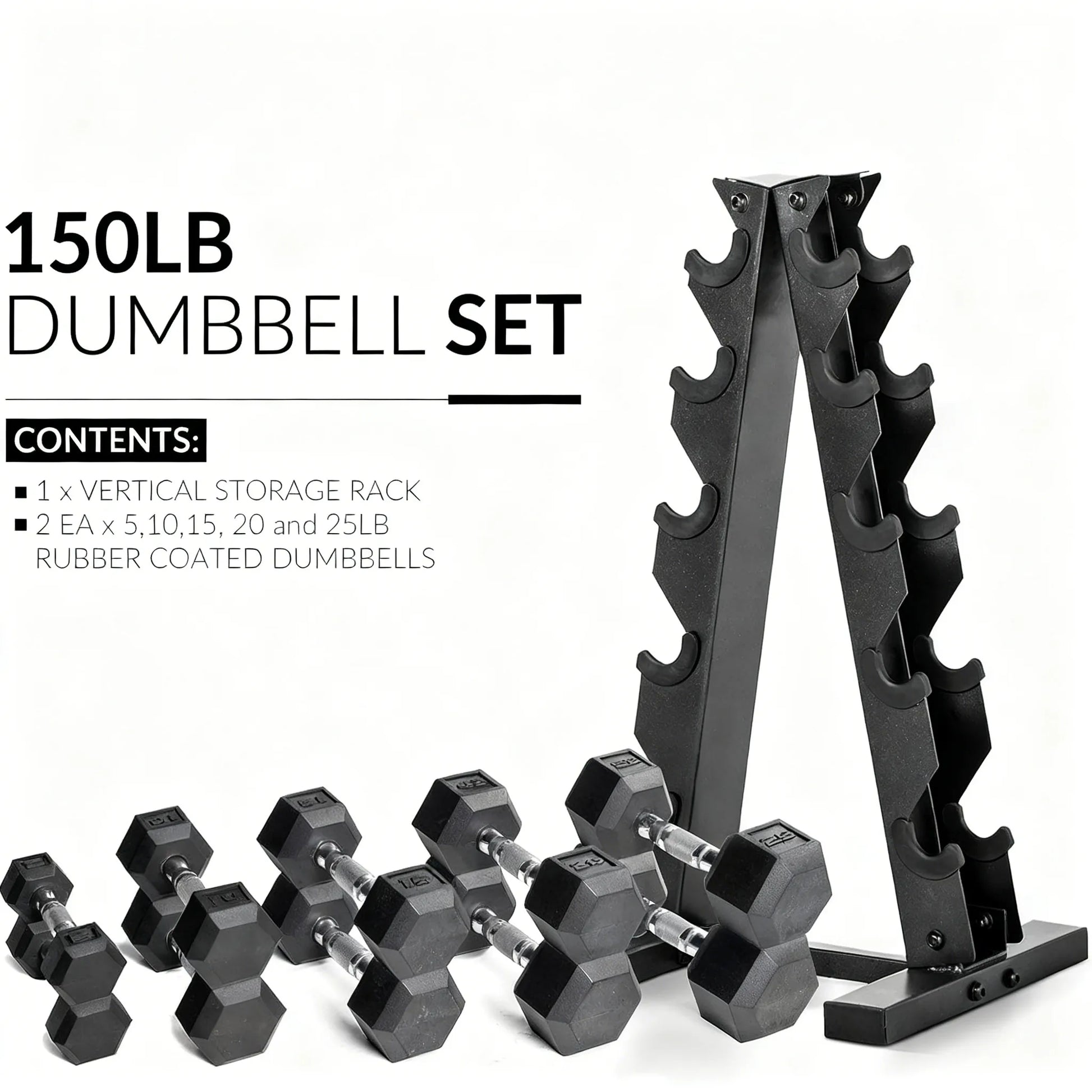 - Complete 150LB Set: Includes 2 pairs each of 5, 10, 15, 20, 25LB rubber-coated dumbbells (total 10 pieces).